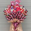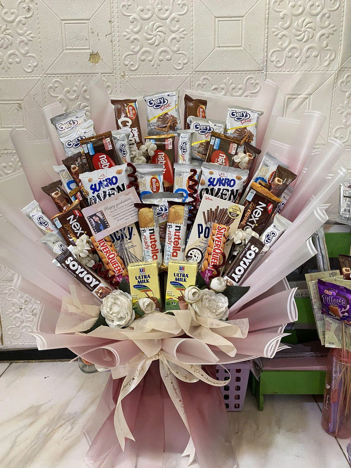 Bó snack được thiết kế sang trọng với tông hồng kem – trắng, kết hợp hoa lụa trang trí. Thành phần là các loại bánh kẹo quen thuộc như bánh quy, wafer, socola thanh, sữa hộp… Phù hợp làm quà tốt nghiệp, sinh nhật, kỷ niệm, dành cho người thích đồ ngọt nhưng không quá gắt.